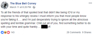 “Well shows what this place is really like, don’t you think people put this on Facebook to show what you are really like and how your speak to people. (sic)”