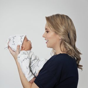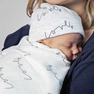 Swaddled in a blanket and wearing a hat from the brand’s new Love Collection, Maven did eventually wake up from her nap for the cute family photos.