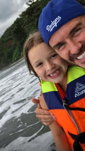 Other snaps show David, 43, enjoying a boat ride with Harper while another sees the pair having a cuddle on a hammock.