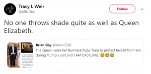 A third tweeted: “The Queen wore her Burmese Ruby Tiara to protect herself from evil during Trump’s visit and I AM CACKLING.”
