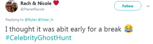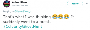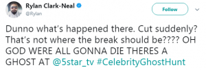 He said: “Dunno what’s happened there. Cut suddenly? That’s not where the break should be???? OH GOD WERE ALL GONNA DIE THERES A GHOST AT @5star_tv”