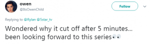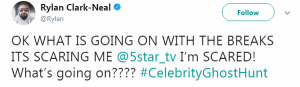 “OK WHAT IS GOING ON WITH THE BREAKS ITS SCARING ME @5star_tv I’m SCARED! What’s going on????”