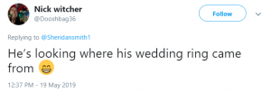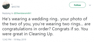 Someone else tweeted: “He’s wearing a wedding ring… your photo of the two of you, you’re wearing two rings… are congratulations in order? Congrats if so. You were great in Cleaning Up.”