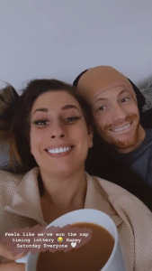 Back at home they cosied up on the sofa with a cup of tea and with baby Rex asleep, the mum-of-three wrote: “Feels like we’ve won the nap time lottery. Happy Saturday everyone.”