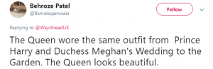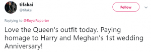 A third added: “Love the Queen’s outfit today. Paying homage to Harry and Meghan’s 1st wedding Anniversary!”
