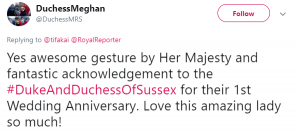 Another wrote: “Awesome gesture by Her Majesty and fantastic acknowledgement to the #DukeAndDuchessOfSussex for their 1st Wedding Anniversary. Love this amazing lady so much!”