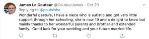 He wrote: “In lieu of wedding gifts, this December I am trying to raise money for my nephew’s school.”
