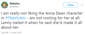 Someone else said: “I am really not liking the Anna Dean character in #TheVictim. I’m not rooting for her at all. Lenny nailed it when he said she’d made it all about her.”