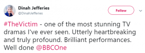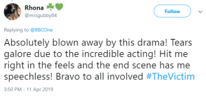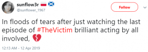 Another tweeted: “In floods of tears after just watching the last episode of #TheVictim brilliant acting by all involved.”