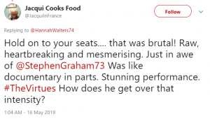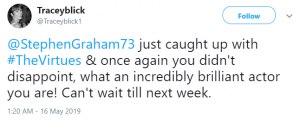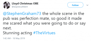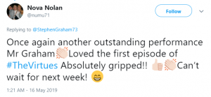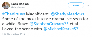 Someone else wrote: #TheVirtues Magnificent. @ShadyMeadows some of the most intense drama I’ve seen for a while. Bravo @StephenGraham73 et al. Loved the scene with @MichaelStarke57.”