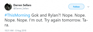 “Gok and Rylan?! Nope. Nope. Nope. Nope. I’m out. Try again tomorrow. Ta-ra,” said another.