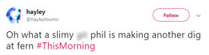 One person wrote on Twitter: “Phil having a little dig at Fern there!” while another wrote: “Oh what a slimy [expletive] Phil is making another dig at Fern.”