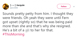A third tweeted: “Sounds pretty petty from him. I thought they were friends. Oh yeah they were until Fern got upset (rightly so) that he was being paid more than she and that’s why she resigned.