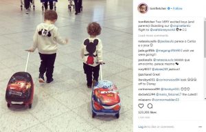 Posting a picture of his and wife Giovanna’s two boys – Buddy Bob and Buzz Michelangelo – pulling their adorable suitcases through the airport, Tom, 32, couldn’t help but share his excitement.