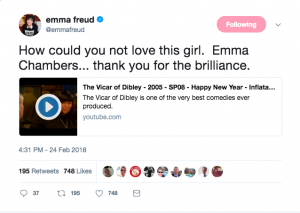 Emma later added a YouTube clip from Vicar of Dibley, writing: “How could you not love this girl. Emma Chambers… thank you for the brilliance.”
