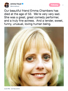 Writer Emma Freud, the wife of The Vicar Of Dibley’s creator, Richard Curtis wrote: “Our beautiful friend Emma Chambers has died at the age of 53.