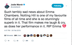 TV presenter Jodie Marsh also tweeted, writing: “Such terribly sad news about Emma Chambers. Notting Hill is one of my favourite films of all time and she is so stunningly superb in it.