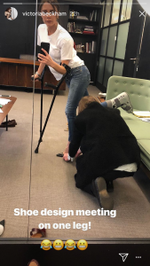 VB wrote: “Shoe design meeting on one leg!” She added a series of laughing emojis.