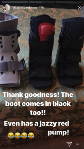 The Spice Girl, who fractured her foot on a family skiing holiday, took to Instagram earlier this week to share a snap of herself wearing her protective boot.