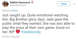 One said: “Just caught up. Quite emotional watching this. Big Brother glory days. Jade gave the public what they wanted. She was also able to play the press at their own game. Good on her. RIP.”