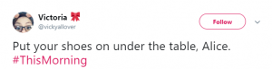 Another tweeted: “Tell Alice to put her foot in her shoe.”