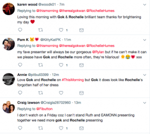Another added: “Loving this morning with Gok & Rochelle brilliant team thanks for brightening my day ❤️”.