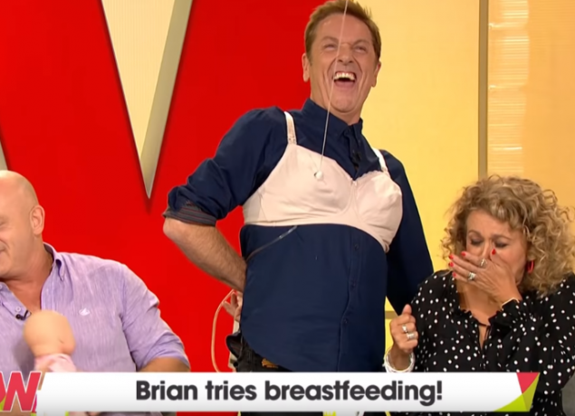 Brian, 56, finally agreed to give the device a go and left the studio before returning wearing the device as he squirted ‘milk’ at the audience while holding a doll.