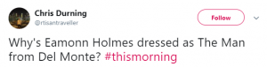One person tweeted: “Why’s Eamonn Holmes dressed as The Man from Del Monte?” while another said: “Eamonn mate, what have you got on????”