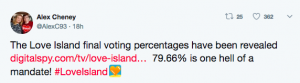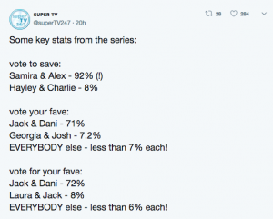 A Twitter account called Super TV also posted some other key stats from the series, showing Dani, 22, and Jack, 26, were consistently viewer favourites.