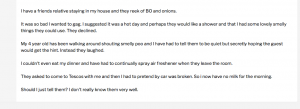 The poster later updated those who had responded to her cry for help, saying: “I did end up strongly hinting to them by giving them some fresh towels and new shower gels and deodorant. They took the hint. But then put back on the same clothes. So it’s not as bad, but lingering. I have not seen a toothbrush either.