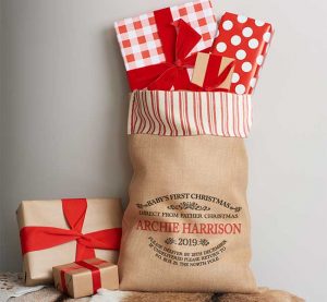Priced from just £22, the sack came with Baby’s First Christmas printed on the front.