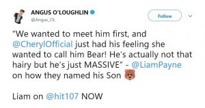 He also revealed how he and Cheryl, who he met ten years ago on the set of X Factor, named their son, saying: “We wanted to meet him first, and [Cheryl] just had this feeling she wanted to call him Bear! He’s actually not that hairy but he’s just MASSIVE.”