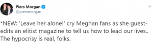 While some may say it’s sour grapes after his one-time friend Meghan apparently ghosted him upon meeting Prince Harry, Piers insists the “stunt” was “shamelessly hypocritical”.