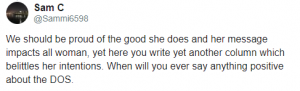 A third tweeted: “We should be proud of the good she does and her message impacts all woman, yet here you write yet another column which belittles her intentions. When will you ever say anything positive about the Duchess of Sussex.”