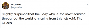 While the line-up includes celebrities, politicians and activists known for championing issues such as diversity, body positivity, transgender rights and climate change, it doesn’t feature “the lady who is most admired throughout the world”, said a royal fan.