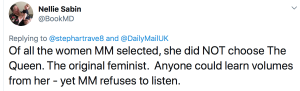 Another added: “Of all the women Meghan Markle selected she did NOT choose the Queen. The original feminist.”