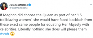Another wrote: “If Meghan did choose the Queen as part of her ’15 trailblazing women’, she would have faced backlash from these exact same people for equating Her Majesty with celebrities. Literally nothing she does will please them.”