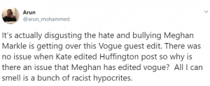 One tweeted: “It’s actually disgusting the hate and bullying Meghan Markle is getting over this Vogue guest edit. There was no issue when Kate edited Huffington post so why is there an issue that Meghan has edited Vogue.”