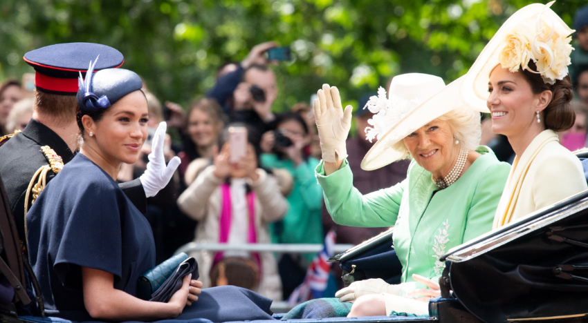 She was joined by her husband Prince William before being seen chatting and laughing with Meghan, Harry and the Duchess of Cornwall as they made their way up the Mall in an open-top carriage.