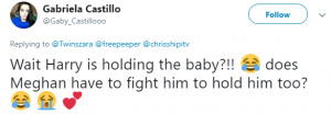 One fan joked on Twitter: “Wait Harry is holding the baby?! Does Meghan have to fight him to hold him too?”