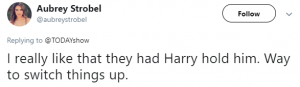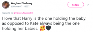 Another said: “I really like that they had Harry hold him. Way to switch things up,” while a third added: “I love that Harry is the one holding the baby, as opposed to Kate always being the one holding her babies.”