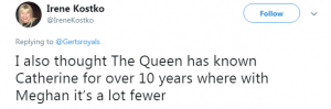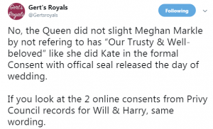 They revealed: “No, the Queen did not slight Meghan Markle by not refering (sic) to has “Our Trusty & Well-beloved” like she did Kate in the formal Consent with offical (sic) seal released the day of wedding. If you look at the 2 online consents from Privy Council records for Will & Harry, same wording.”