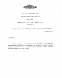 It is only on an announcement of consent made just before William and Kate’s wedding, that Kate is referred to as “our trusty and well beloved Catherine Elizabeth Middleton”.