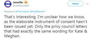 All well and good you might think, but according to royal watchers there was a slight change of wording from Prince William and Kate’s official consent.