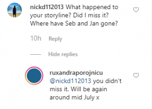 In the comments one fan was confused by her character’s absence and wrote: “What happened to your storyline? Did I miss it? Where have Seb and Jan gone?”