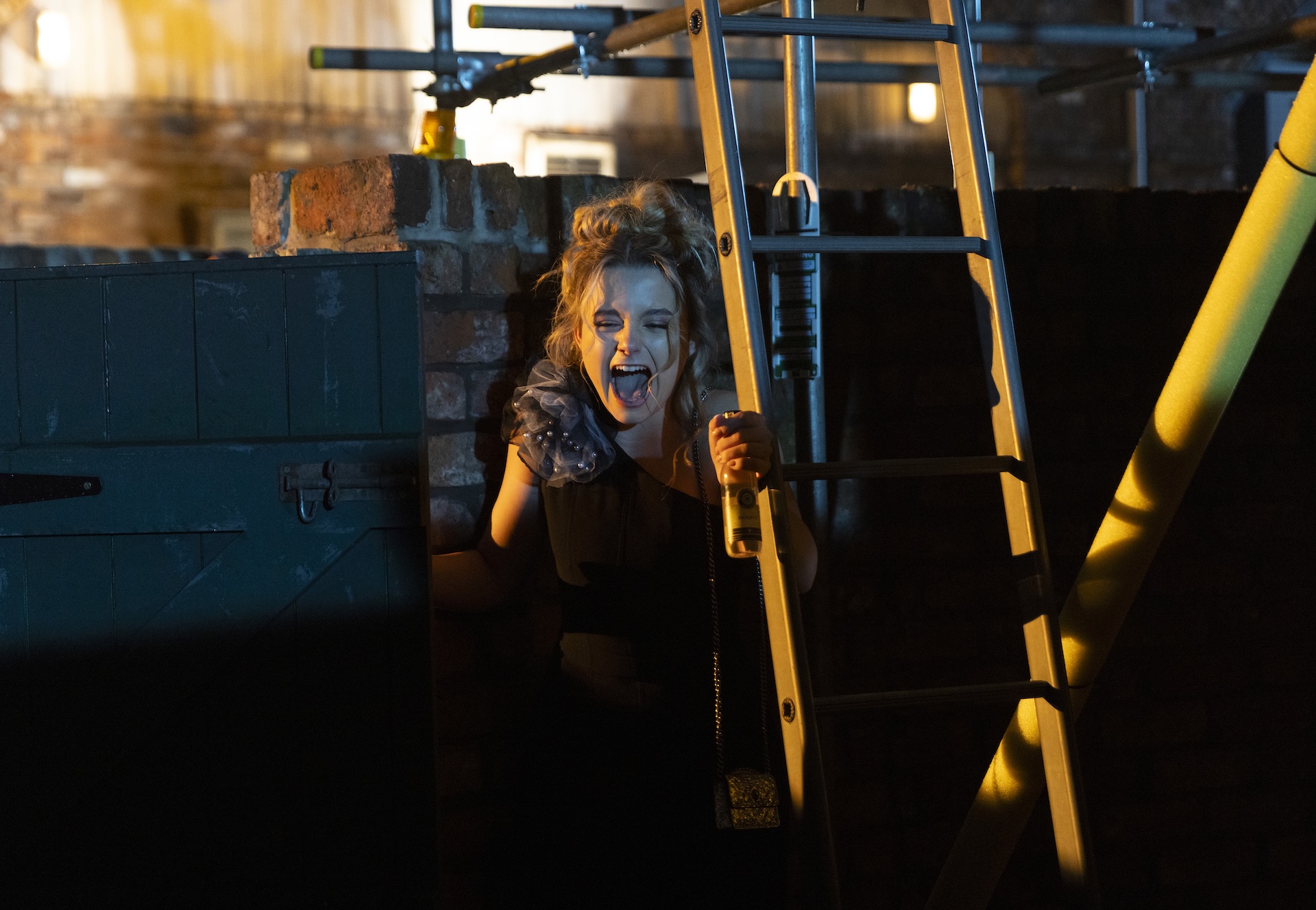 She’s then thrown out of No.1 and left in the ginnel on her own when she overhears Maggie and Melanie and records some incriminating information.