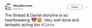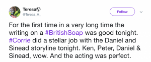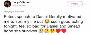 Viewers flocked to social media to praise the soap for the moving and heart-wrenching scenes that focused solely on Daniel, Sinead, Peter and Ken.
