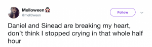 By the end of the episode Daniel and Sinead had made up, agreeing to face whatever was thrown at them together.