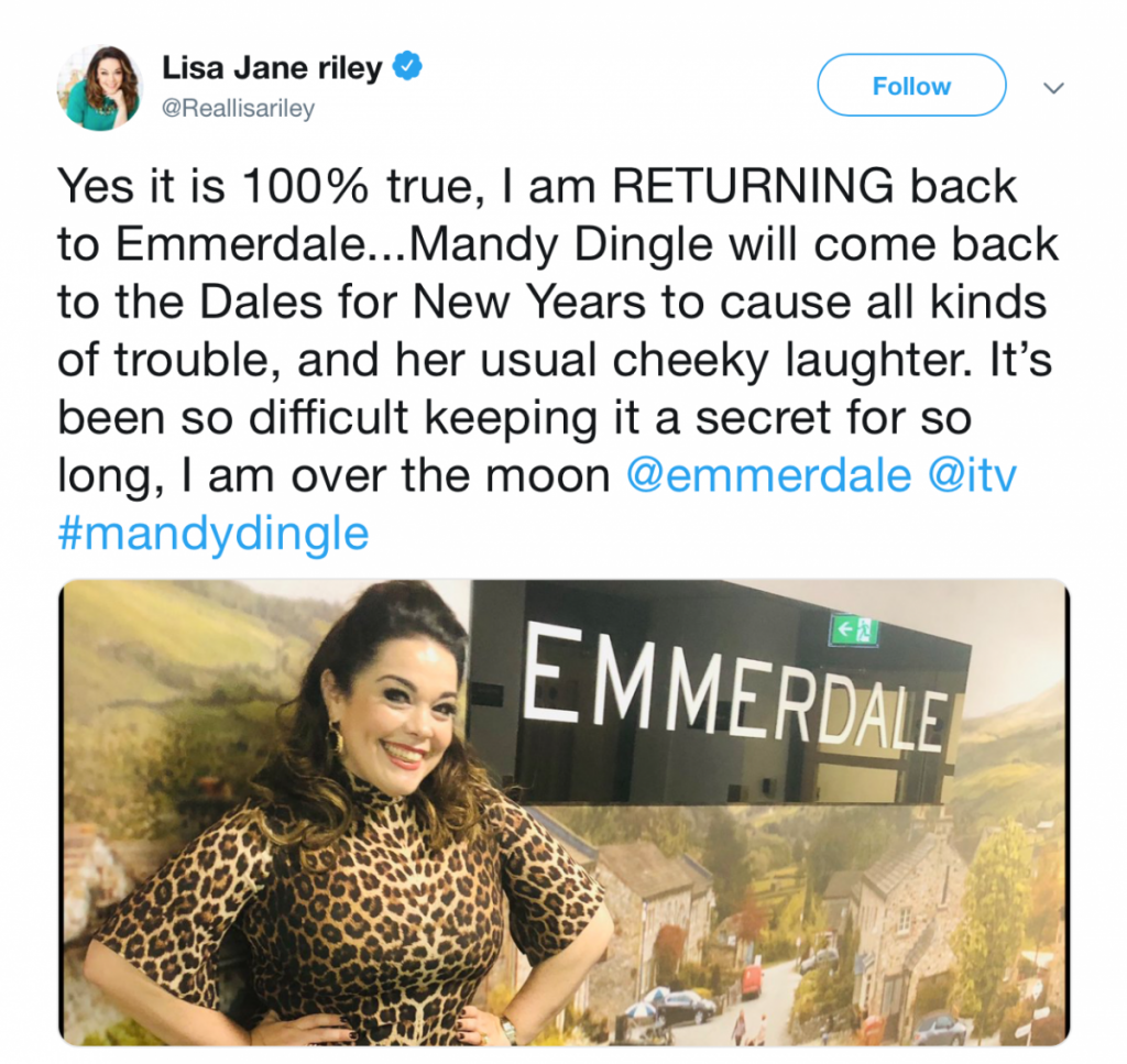 Earlier today, Emmerdale confirmed actress Lisa Riley will be returning to Emmerdale as Mandy Dingle after 17 years away from the soap.