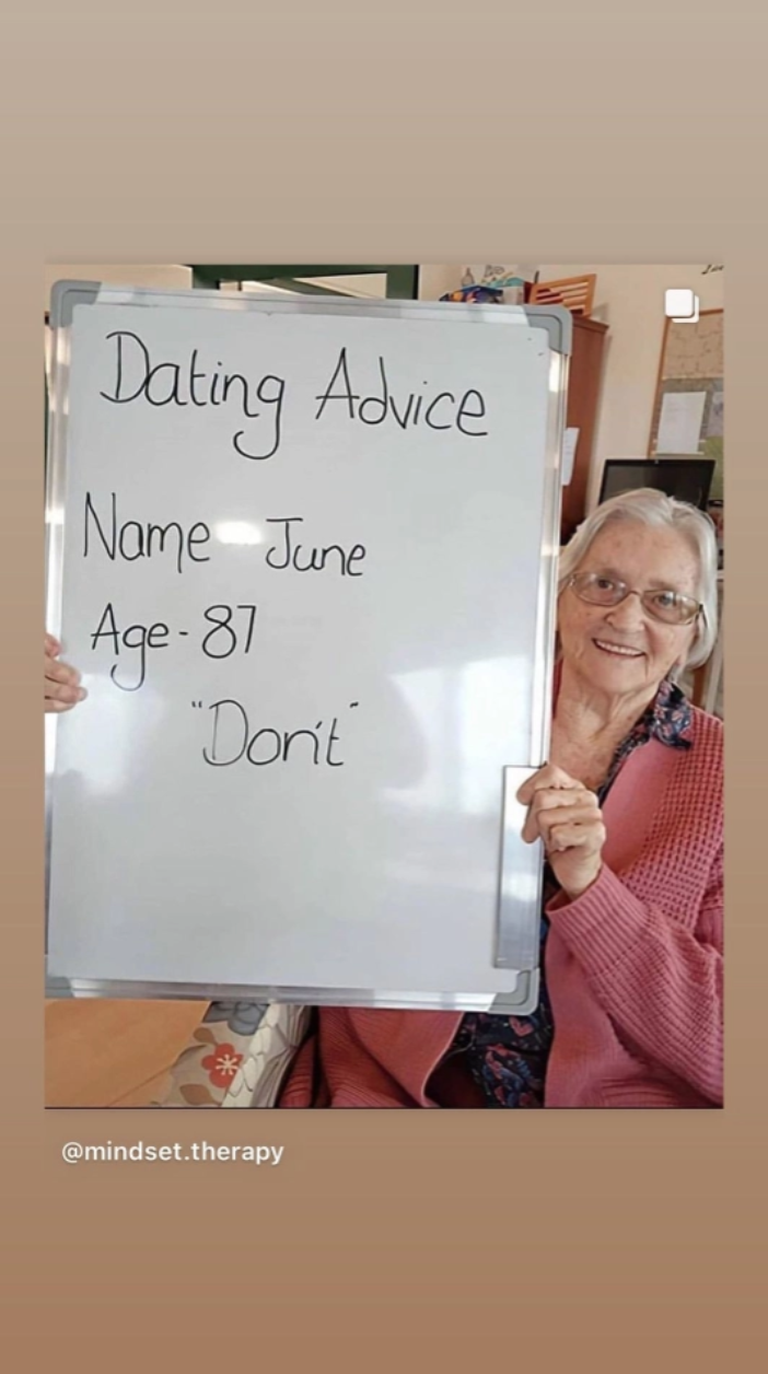 It reads: “Dating advice. Name June, Age- 81, Don’t.”